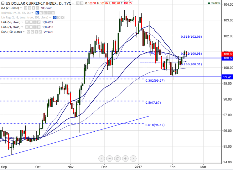 - The major support is around 100.58 (21- day EMA) and any break below targets 100/99.25 (23.6% fibo)/98.85/98.30.