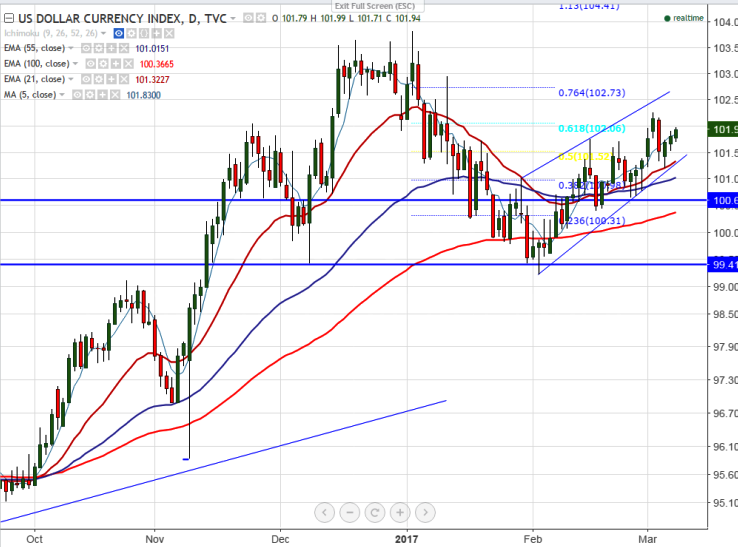 - On the higher side, index has broken 61.8% retracement of 102.26 and 101.22 at 101.87 and is trading slightly above that level .It confirms minor bullishness and a jump till 102.30/102.95 (Jan 1st 2017 high).