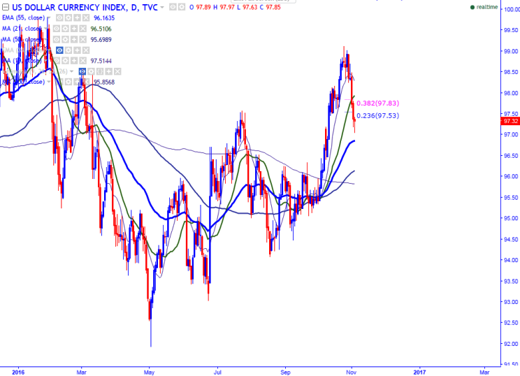 - US Dollar index declined continuously for the past four trading session .The index has formed a temporary top around 99.12 on Oct 10th 2016 high. It is currently trading around 97.36.