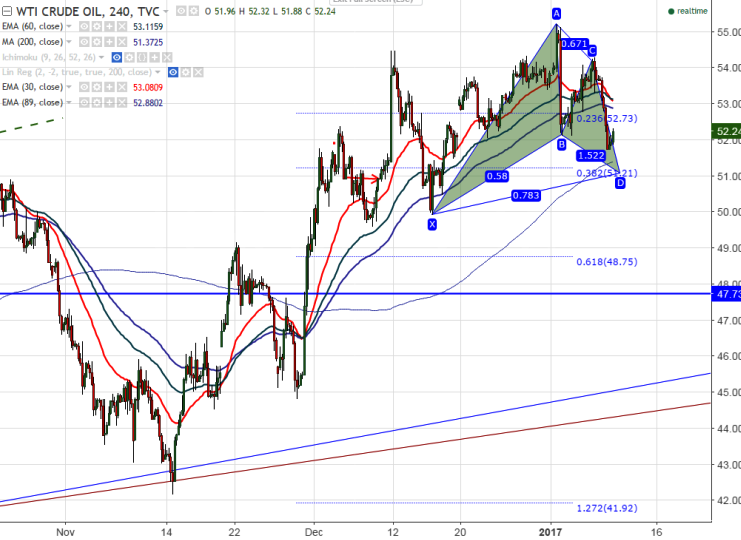 - US Oil has formed bullish Gartley pattern in the four hour chart. It is currently trading around $52.25.
