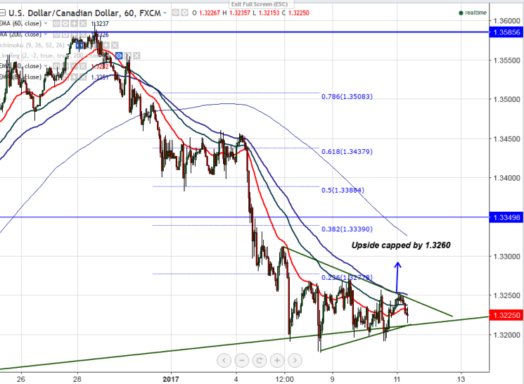 - USD/CAD upside capped by 89- day EMA and any break above will take the pair to next level 1.332 (Jan 5th 2017 high)/1.334 (38.2% retracement of 1.35985 and 1.31782)/1.3400.