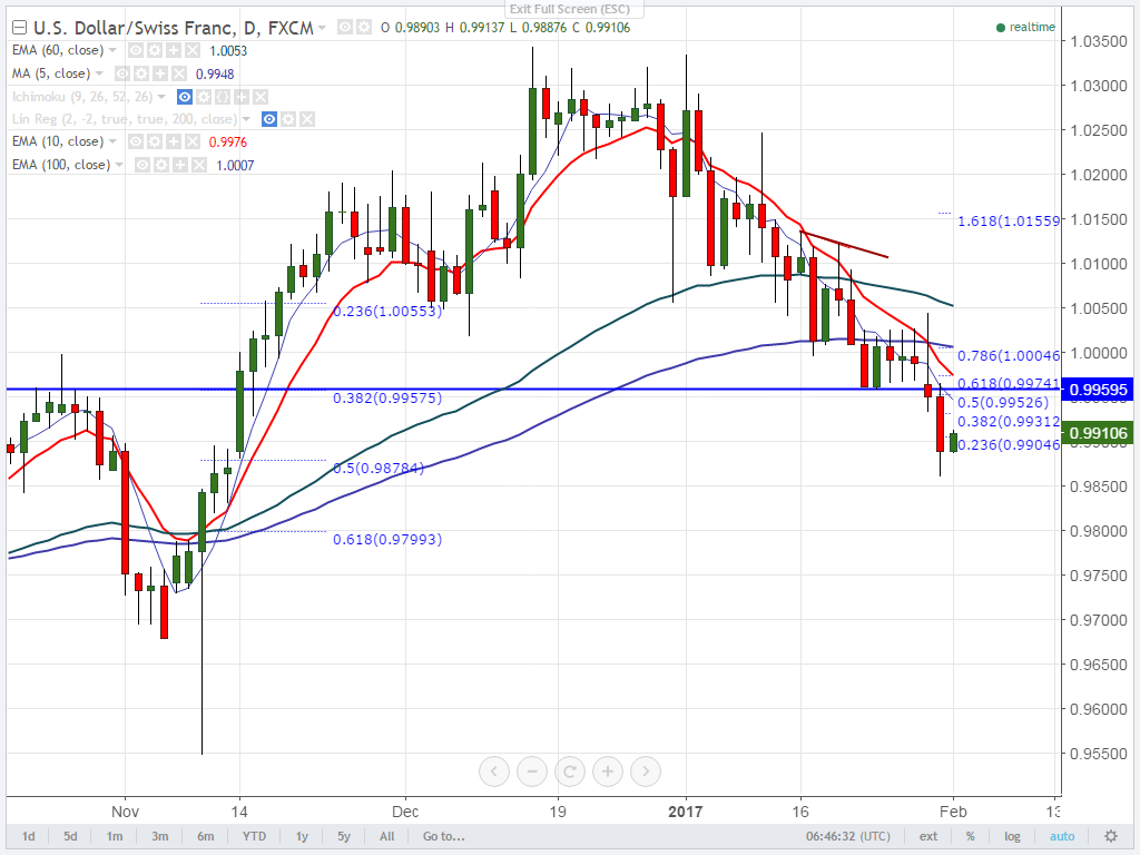 - USD/CHF broken major support of 0.99575 yesterday and declined till 0.98611. The pair has taken support near 200- day MA and jumped from that level.