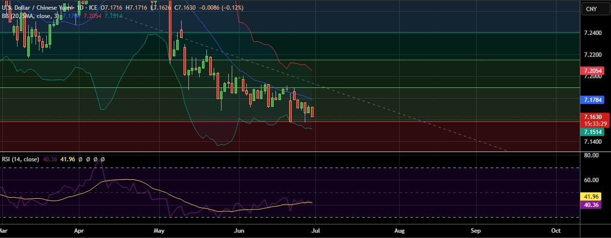 • Support is seen at 7.158 (23.6%fib) and break below could take the pair towards 7.152 (Lower BB).