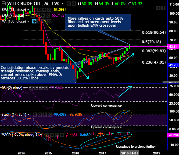 Amidst crude oil bulls are lingering at 3-year highs (refer above chart) as falling U.S. crude supplies provide support, the above trades seem to be performing as the underlying currency pairs are moving in tandem with the energy prices. The U.S. EIA reported in its weekly report yesterday that crude oil inventories dropped by 4.9 million barrels that opens the room for new entrants in these trades.