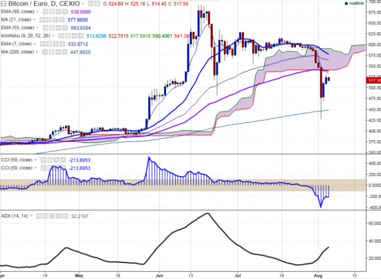 Long-term trend remains to be bullish. In the daily chart, BTC/EUR is trading slightly above 500 levels but it should close above 90 days EMA for further bullishness.