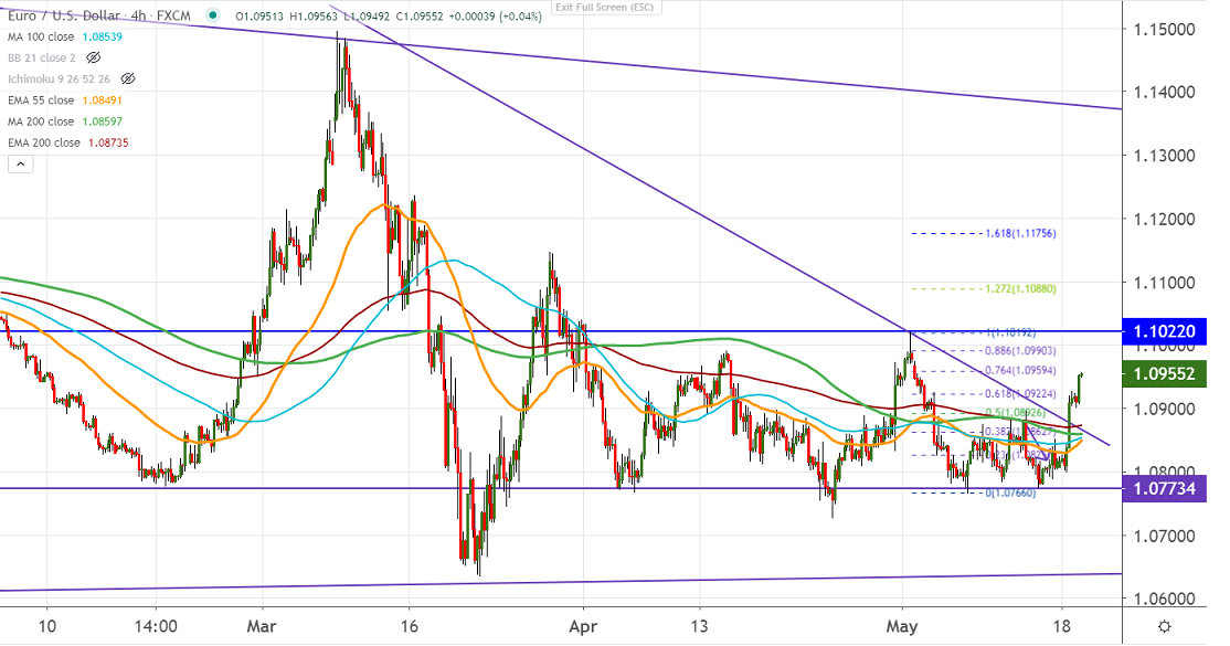 EURUSD trades higher and jumped more than 50 pips after the German ZEW sentiment index. The German ZEW sentiment rose to 51 May compared to forecast of 32 and Eurozone ZEW rose to 46 vs -12.1 expected. The pair hits a high of 1.09563 and Is currently trading around 1.09533.