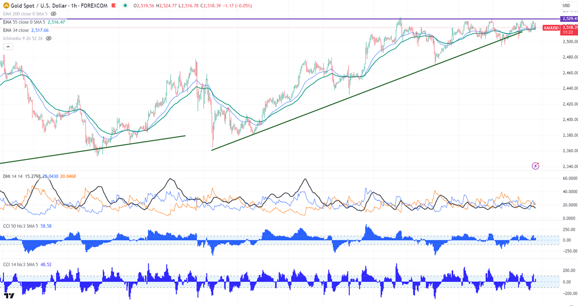 The yellow metal is trading above 34 and 55 H EMA in the hourly chart ($2516 and $2517.80). The weakness can be seen only if it closes below $2500. A break below targets $2490/$2470 is possible.