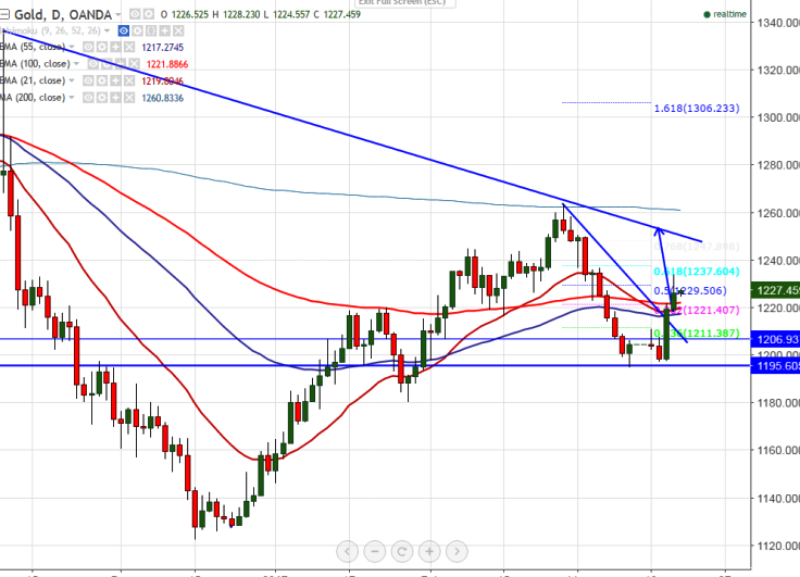 - Technically, near term resistance is around $1229 (daily Kijun-Sen) and any break above will take the yellow metal till $1237 (61.8% retracement of $1263.95 and $1195)/$1247.