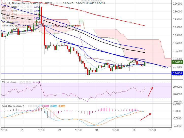 - USD/CHF has formed a minor bottom around 0.94385 and slightly recovered from that level. The pair jumped till 0.94747 and is currently trading around 0.94698.