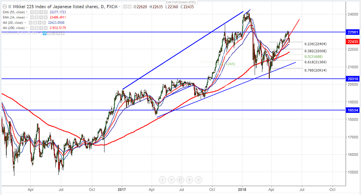 - Asian markets are trading extremely weak of more than 1% on renewed geo political tensions between US -China.US President Trump ordered his commerce department to consider probe into fresh tariffs on foreign vehicles. “Core industries such as automobiles and automotive parts are critical to our strength as a nation,” Trump said in a statement late Wednesday. Dow Jones recovered almost more than 200 points from low after Fed minutes meeting. US futures is trading marginally negative with Dow Jones at 24807 (0.18% lower) and S&P500 2725 (0.15% lower). It is currently trading around 22420 0.88% lower.