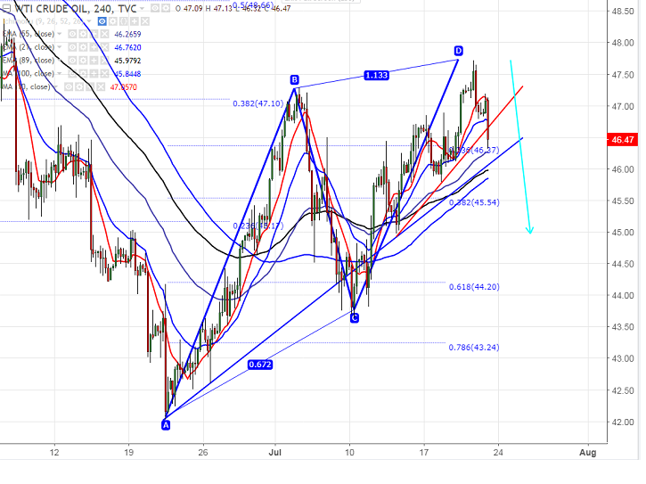 - US Oil was trading higher for the past ten days from the low of $43.69 made on Jul 10th 2017. It has made a high of $47.71 and declining sharply from that level. It is currently trading around $46.47.