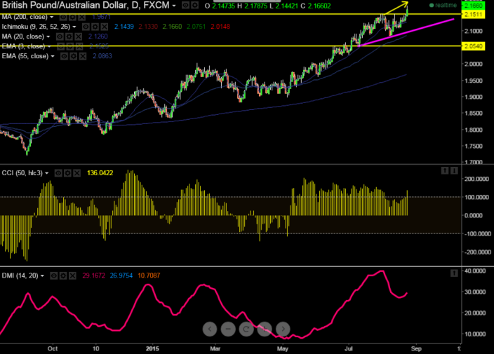 - GBP/AUD broken major resistance of 2.15271 and is trading at 2.1650 level. It has broken ascending triangle pattern resistance at 2.1527 and any break above would extend gains till 2.1933 (161.8% retracement of 2.1527 and 2.0870).