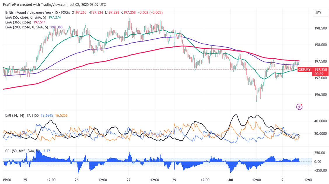 ‘The GBP/JPY pair is trading above 55 and 200 EMA (Short-term) and below 365 EMA (long-term) on the 15-min chart, confirming a bullish trend. Any violation below 196.70 indicates the intraday trend is weak. A dip to 196/195/194/193.70 is possible. Immediate resistance is at 197.52, a breach above this level targets 197.75/198.35/198.80/200/202.