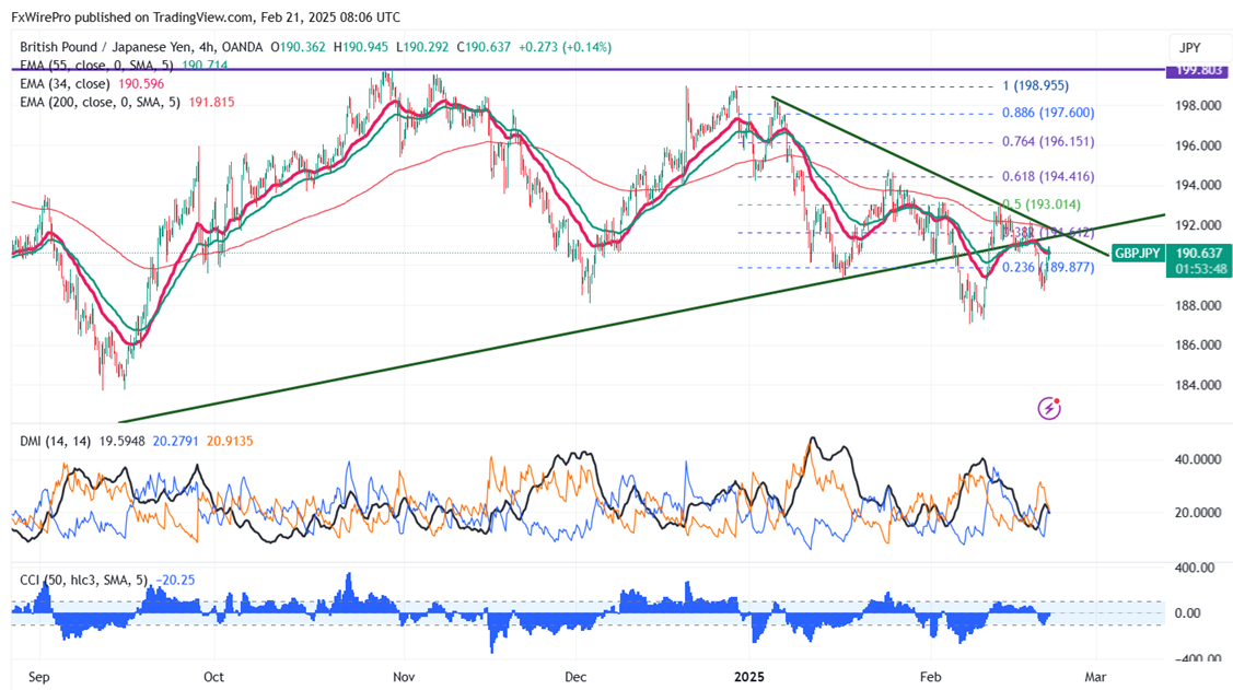The GBP/JPY pair is trading below 34 and 55 EMA (Short-term) and 200 EMA (long-term) on the 4-hour chart, confirming a bearish trend. Immediate resistance is at 191; a breach above this level targets of 192.20. Any close above 192.20 in 4-hour chart confirms further bullishness. Downside support is at 190.29 with additional levels at 189.70/189/188/187.25/185.
