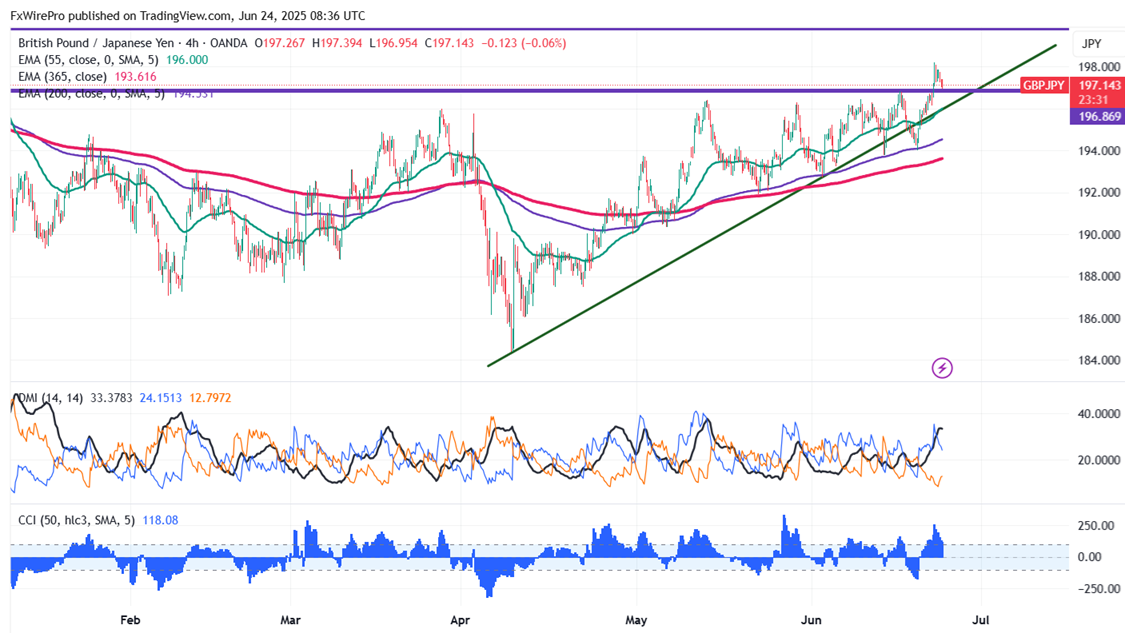 ‘The GBP/JPY pair is trading above 34 and 55 and 200 EMA (Short-term) and 365 EMA (long-term) on the 4-hour chart, confirming a bullish trend. Any violation below 196.75 indicates the intraday trend is weak. A dip to 196/195/194/193.70 is possible. Immediate resistance is at 198.25 a breach above this level targets of 200/202.