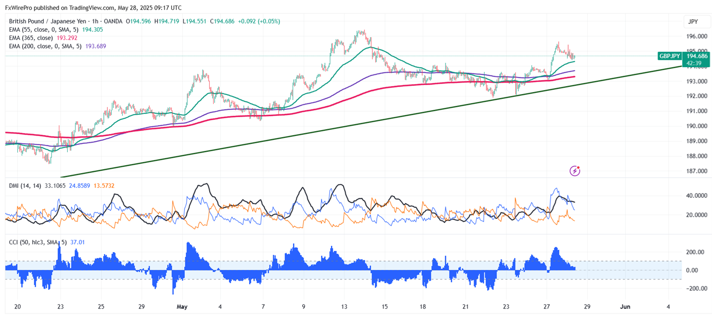 The GBP/JPY pair is trading above 55 and 200 EMA (Short-term) and 365 EMA (long-term on the 1-hour chart, confirming a bullish trend. Any violation below 194.25 indicates the intraday trend is weak. A dip to 193.65/193.30/192.85/192/191.70/191 /190 is possible. Immediate resistance is at 195.65,a breach above this level targets of 196.50/198.