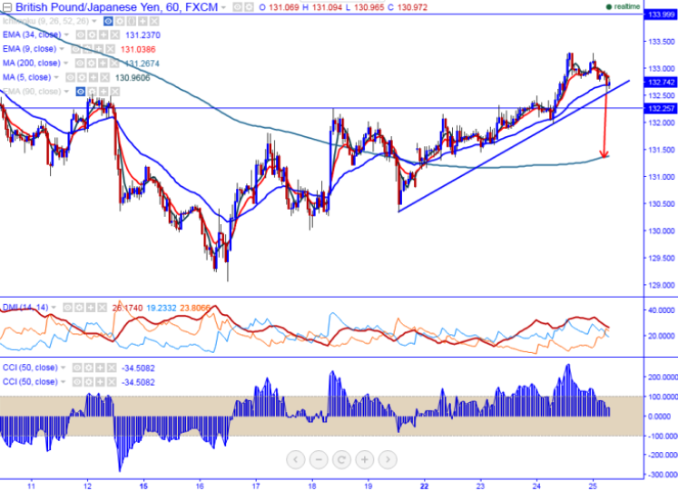 - Any break below 131.95 will drag the pair till 131.40 (10- ay MA)/131in the short term. The minor support is around 132.47.
