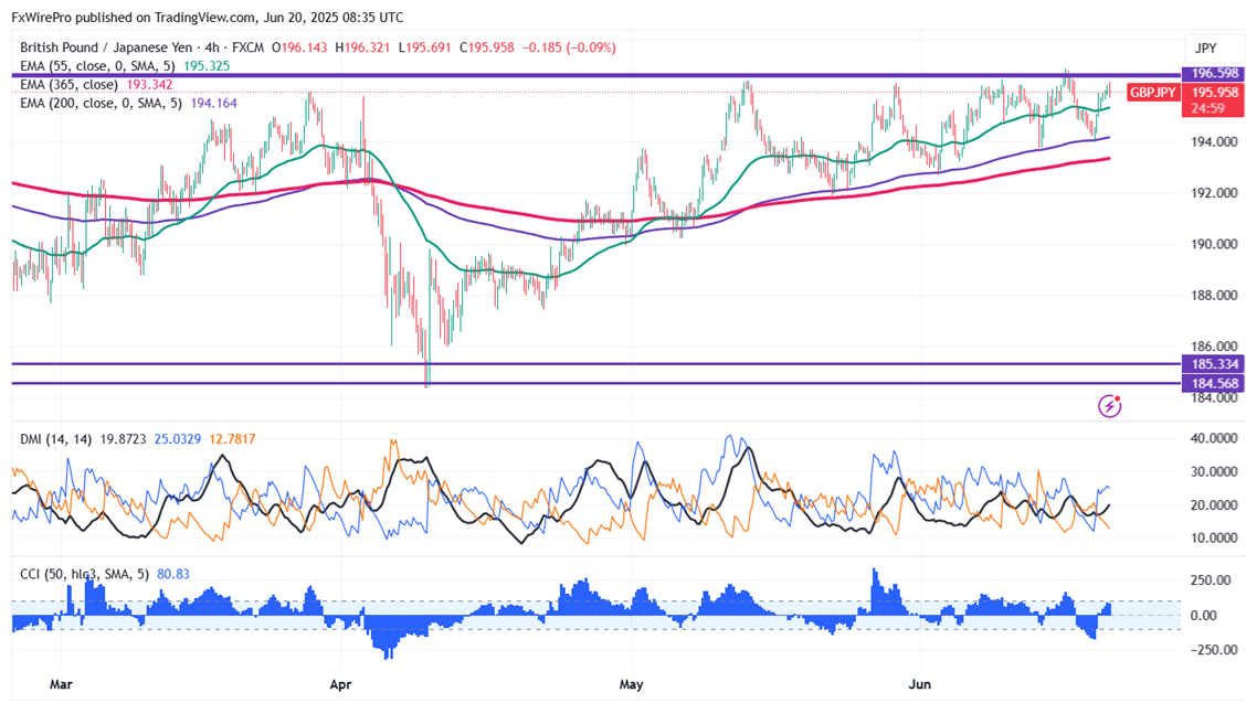 ‘The GBP/JPY pair is trading above 34 and 55 and 200 EMA (Short-term) and 365 EMA (long-term) on the 1-hour chart, confirming a bullish trend. Any violation below 195.35 indicates the intraday trend is weak. A dip to 195/194/193.70 is possible. Immediate resistance is at 196.35 a breach above this level targets of 196.85/198/200. Any major uptrend is possible only above 196.85.