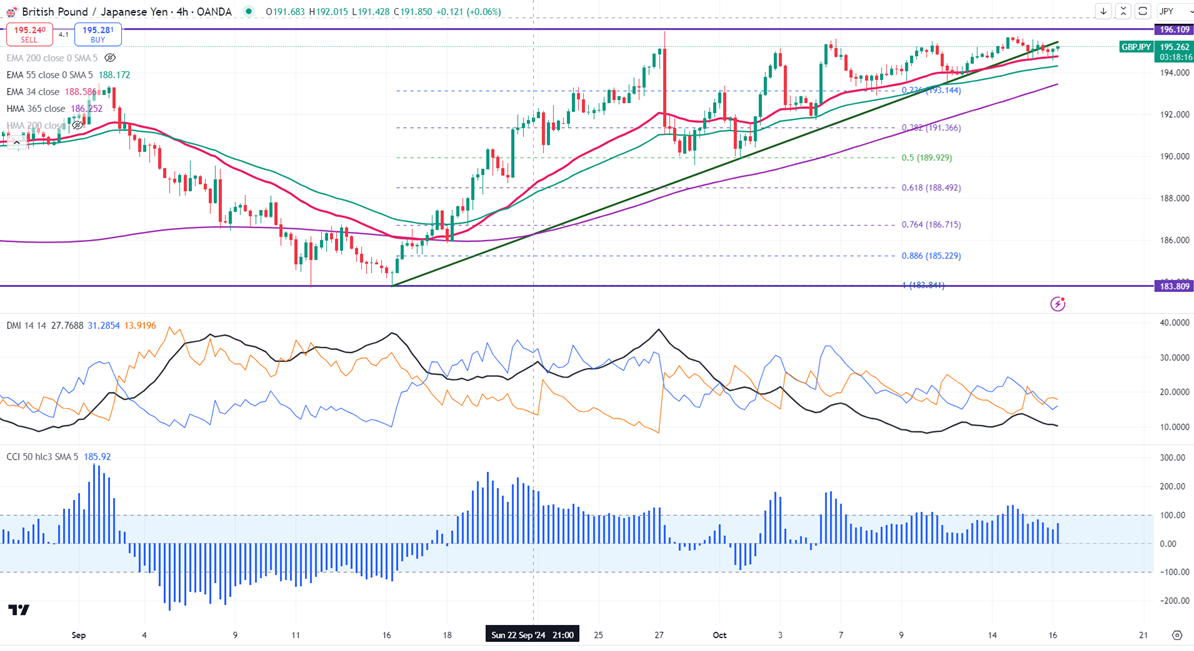 The pair is trading above short-term 34, above 55 EMA (194.74 and 194.28) and long-term 365 Hull MA (193.37) in the 4-hour chart.