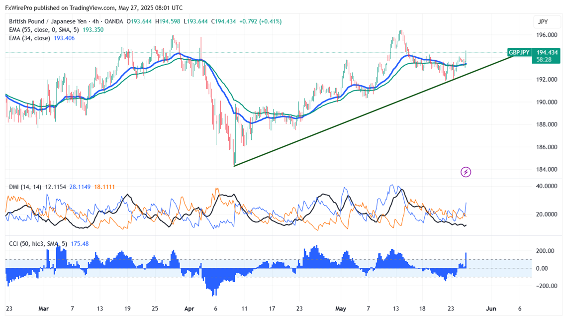 The GBP/JPY pair is trading above 55 and 200 EMA (Short-term) and 365 EMA (long term on the 4- hour chart, confirms a bullish trend. Any violation below 194 indicates intraday trend is weak. A dip to 193.30/192.85/192/191.70/191 /190 is possible. Immediate resistance is at 195,a breach above this level targets of 196.50/198.