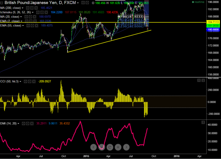 GBP/JPY has taken support near trend line 180 (trend line joining 167 and 174.86) and slightly recovered from that level.