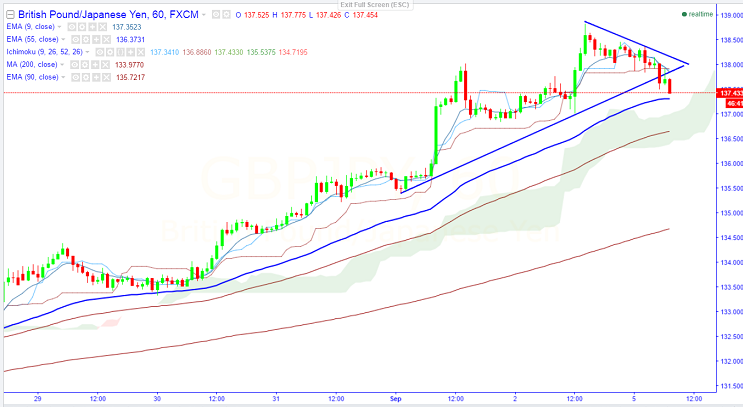 - On the lower side support stands at 137.30 and nay violation below targets 136.65/136 in the short term.The pair is trading below hourly Tenken-Sen (137.95) and hourly Kijun-Sen (137.92). So slight dips till 136 is possible .