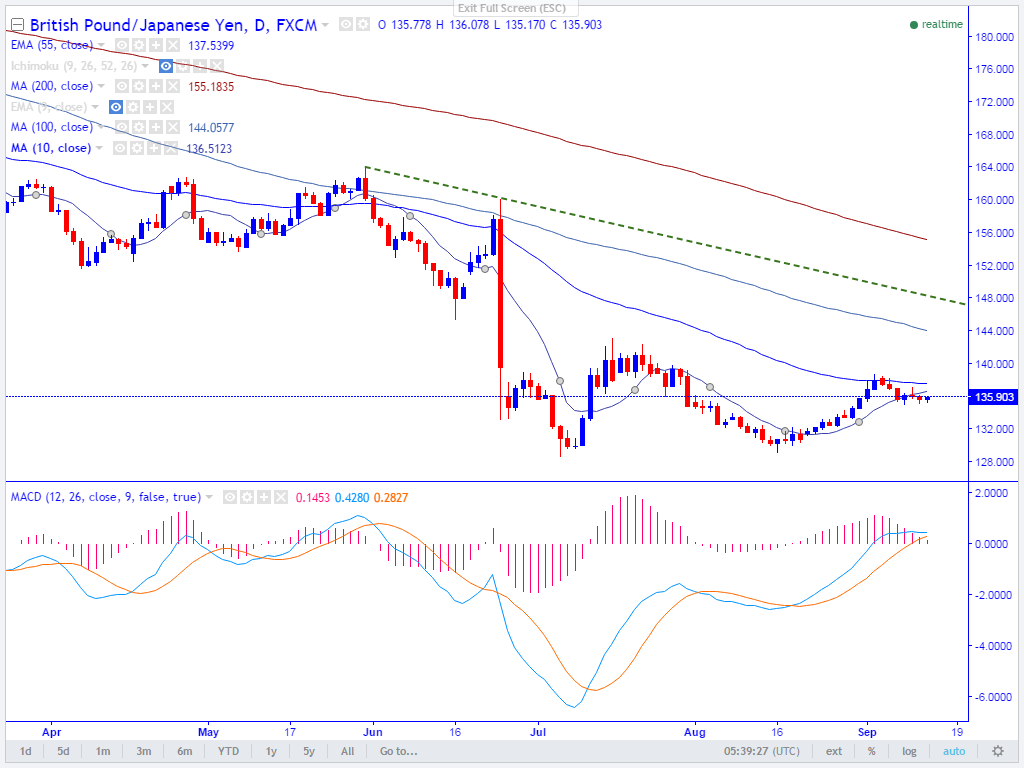 - The pair is facing strong resistance at 10- day MA and any break above targets 137.15/138.It should close above 138.85 for further bullishness.