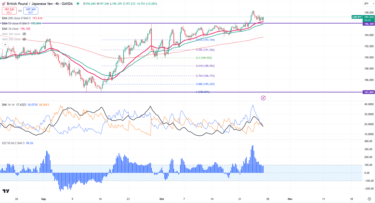 It may be wise to consider buying on dips around 196, with a stop loss set around 195.40, aiming to take profit levels at 197.37 or 198.