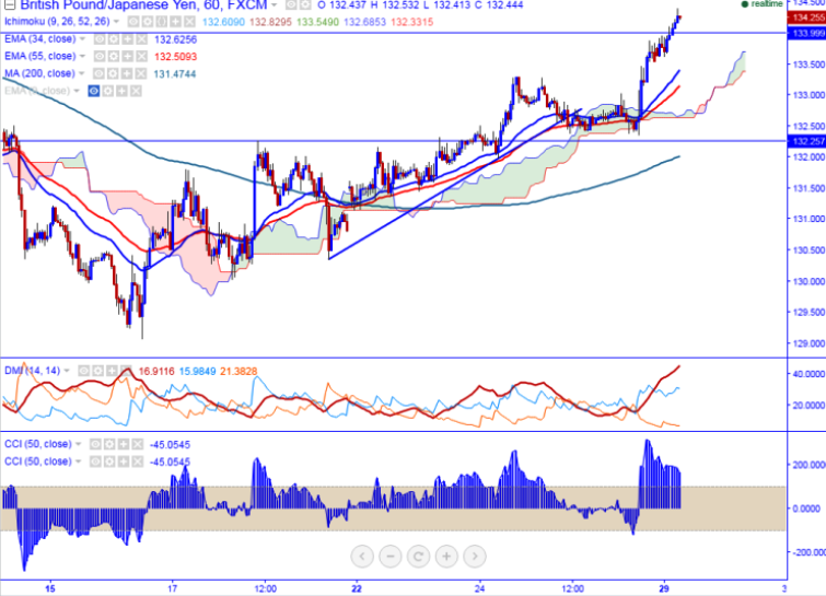 - The intraday trend is still bullish as long as long as support 133.25 holds. Any break a below 133.25 will drag the pair down till 132.67 (100 –H MA) /131.97 (200 –HMA).The pair should close below 131.97 for further weakness.