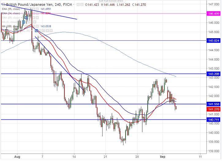 - GBP/JPY declined sharply and has broken major support 141.55 low made on Aug 31st 2017 after hitting high of 142.99 and any further bullishness can be seen only above 143.20. The JPY trades higher against all major pair after renewed tensions in North Korea. It is currently trading around 141.25.
