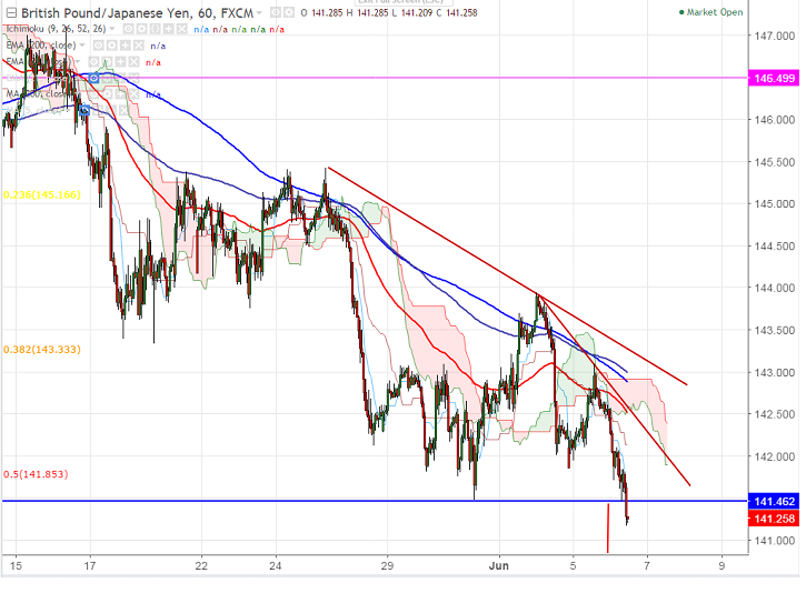 - GBP/JPY continues its losing streak after hitting high of 143.95 on Jun 2nd 2017. The pair broken temporary bottom around 141.48 on May 31st 2017. It is currently trading around 141.22.