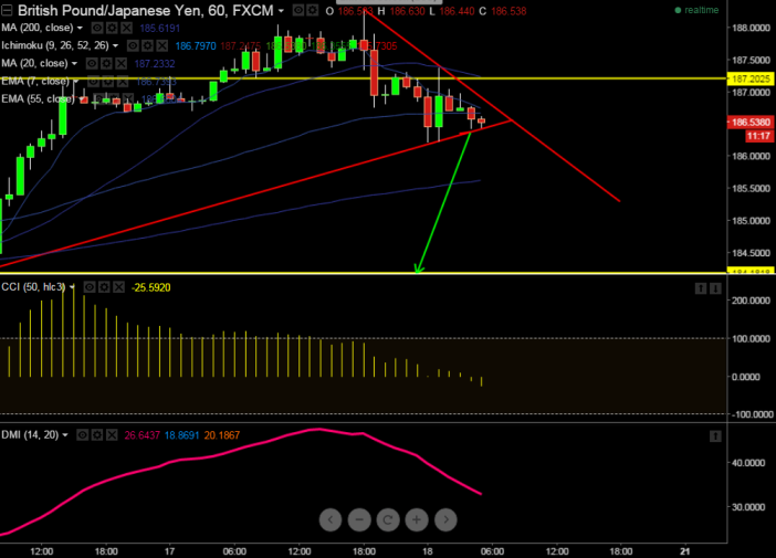 - Intraday major support is around 186.40 (trend line joining 184.24 and 186.21) and any break below will drag the pair further down till 185.60/185 in short term.