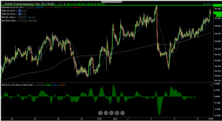 - GBP/JPY has made a high of 187.60 and has started to decline from that level. It is trading around 187.25 level.