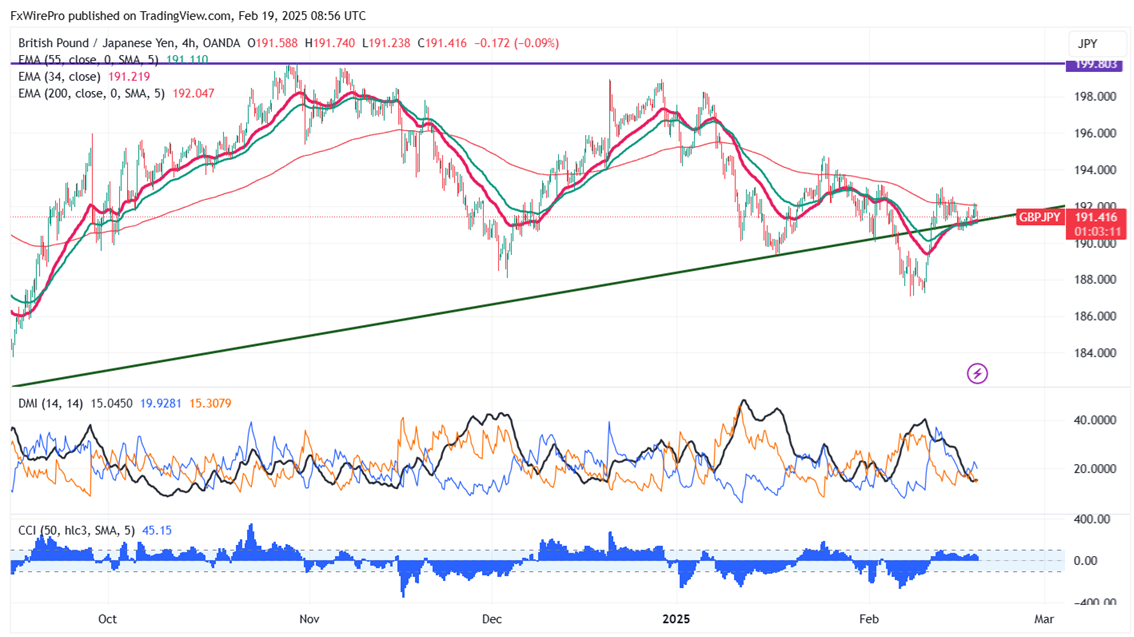 The GBP/JPY pair is trading above 34 and 55 EMA (Short-term) and 200 EMA (long-term) on the 4-hour chart, confirming a bullish trend. Immediate resistance is at 192; a breach above this level targets of 193/193.36/194/195/195.60/196.25/197. Downside support is at 191 with additional levels at 190.35/189.80/189/188.