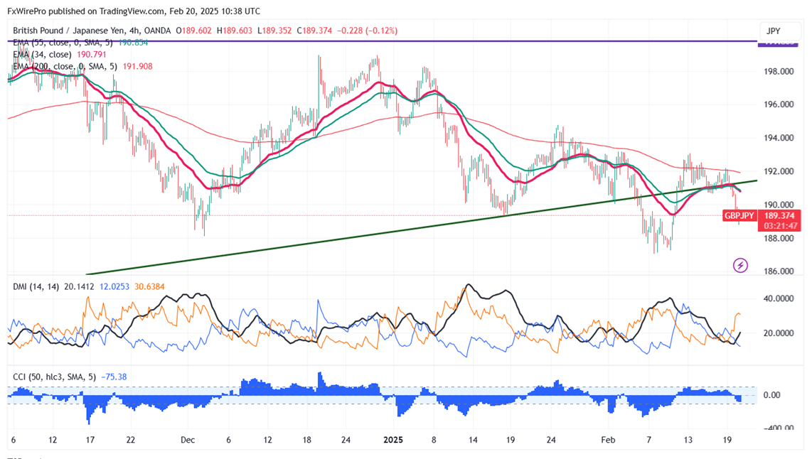 The GBP/JPY pair is trading below 34 and 55 EMA (Short-term) and 200 EMA (long-term) on the 4-hour chart, confirming a bearish trend. Immediate resistance is at 190; a breach above this level targets 190.64/191/192. Any close above 192 in the 4-hour chart confirms further bullishness. Downside support is at 188.70 with additional levels at 188/187.25/185.