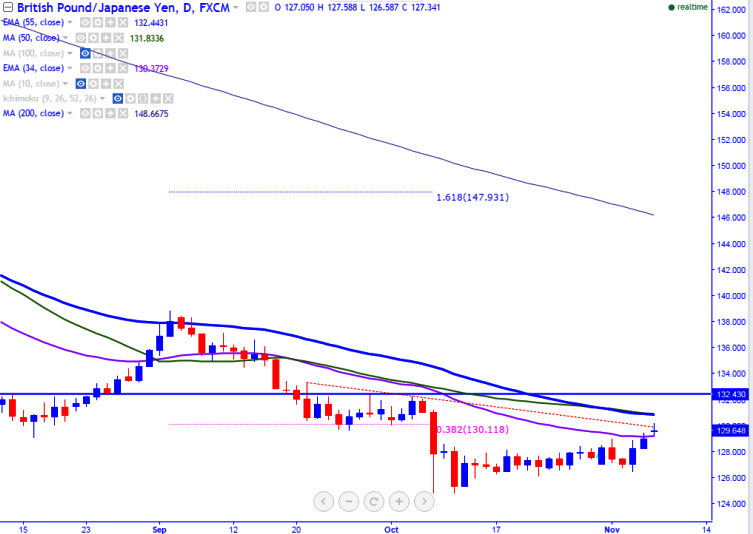 - GBP/JPY has broken major resistance 129.15 (34- day EMA) and jumped till 130.23 at the time of writing. It is currently trading around 129.87.