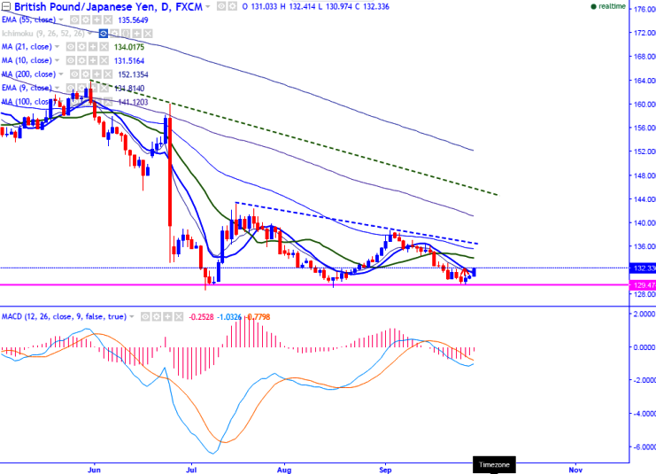 - GBP/JPY is trading well above short-term moving average 5- day MA (130.89) and 10- day MA (131.80). But it is trading slightly below daily Tenkan-Sen (132.45). Any break above Tenken-Sen will confirm minor bullishness, a jump till 134.25 (daily Kijun-Sen) /135.68 (55- day EMA) is possible.