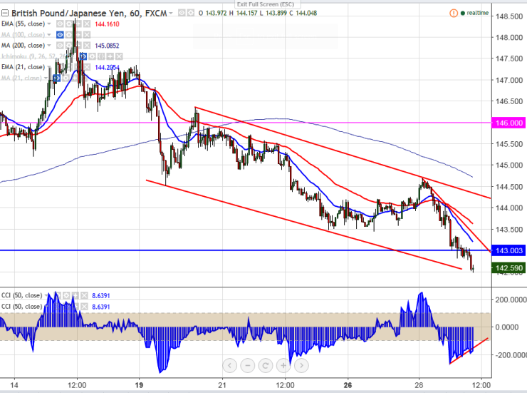 - The pair shown a slight jump after hitting low of 142.77 at the time of writing. GBP/JPY broken the support of 142.77 and declined till 142.55 at the writing.It is currently trading around 142.57.