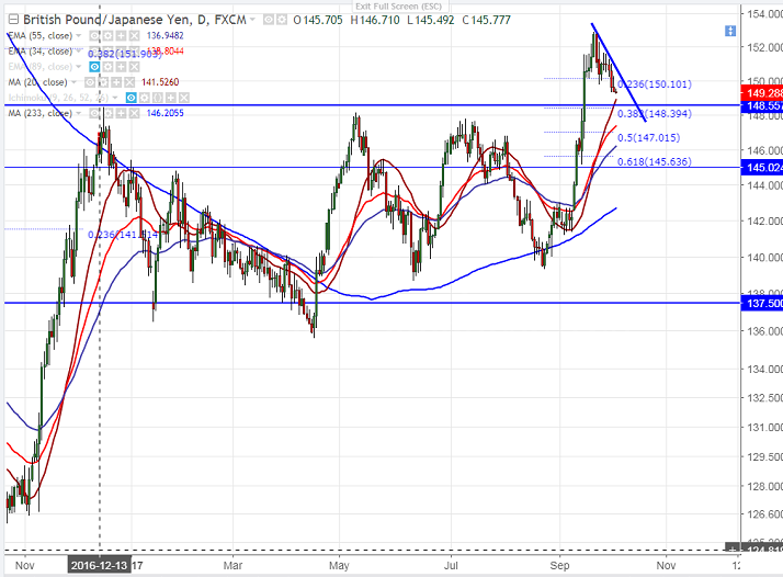 - GBP/JPY continuing its losing trend for third consecutive days and is trading well below psychological support at 150. It is currently trading around 149.28.
