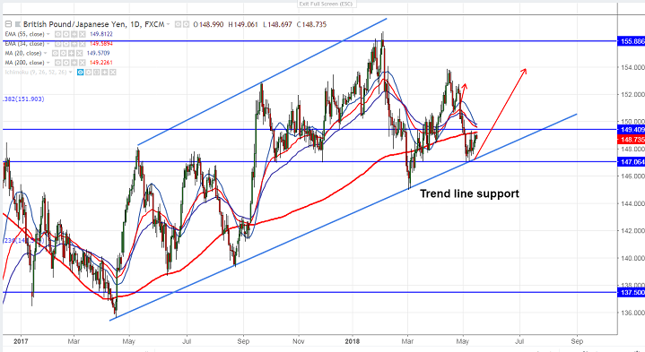 - GBP/JPY has once again shown a minor decline after showing a minor jump above 200- day MA at 149.17. The pair hits high of149.19 and started to decline slightly from that level. GBP was trading weak against all majors after weaker than expected UK jobs data. The pair has taken support near trend line and shown a good jump of more than 200 pips from the low of 147.05. It is currently trading around 148.66.