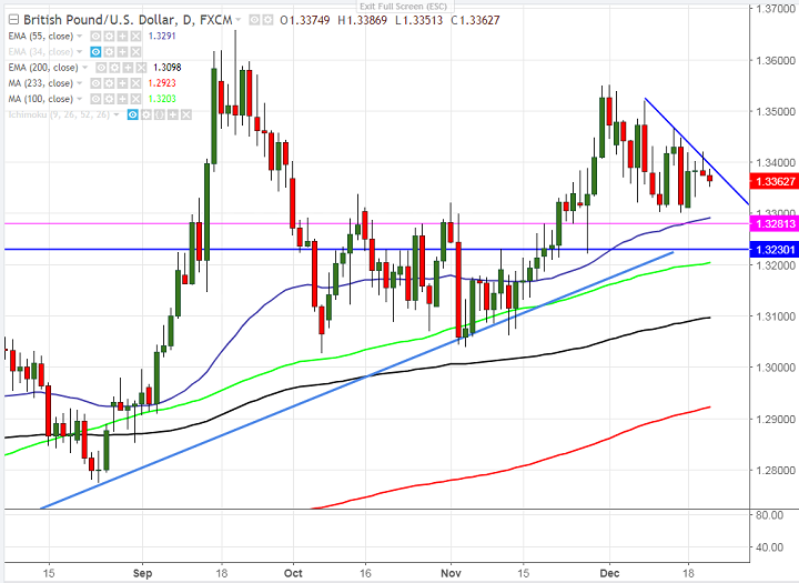 - Cable is trading very flat for the past one week. The UK and EU has reached deal for the first phase on Friday and next phase on trade negotiations is expected to happen next week. The pair has recovered almost 100 pips from the low of 1.33029 made on Dec 15th 2017 and is currently trading around 1.33637.