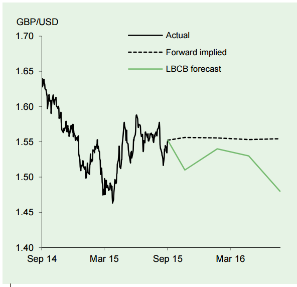 "While we have pushed out our call for the first rise in US interest rates by three months - to December - our view that UK rates will rise in early 2016 is unchanged. We target 1.56 by year end and 1.45 by end 2016", says Lloyds Bank.