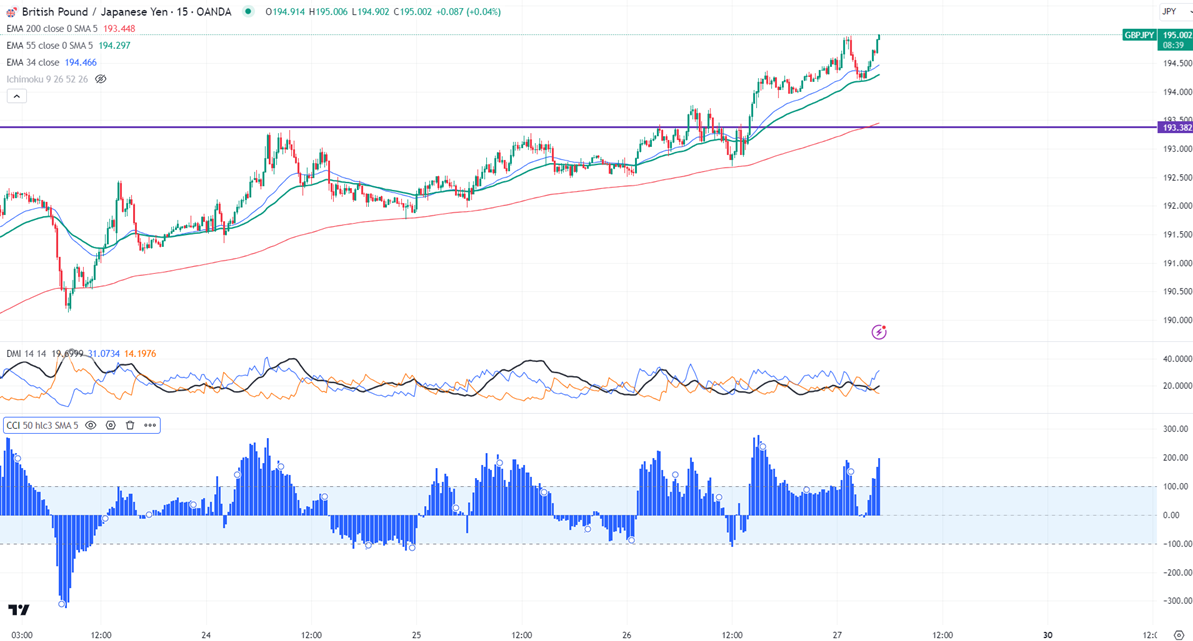 The pair is trading above short-term 34,55 EMA (194.24 and 194.40) and long-term 200 EMA (193.40) in the 15 min chart.