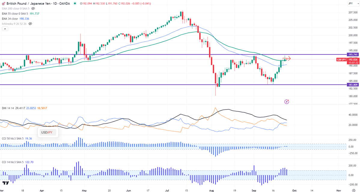 The pair is trading above the short-term 34, below 55 EMA (190.23 and 191.72), and long-term 200 EMA (191.51) in the daily chart.