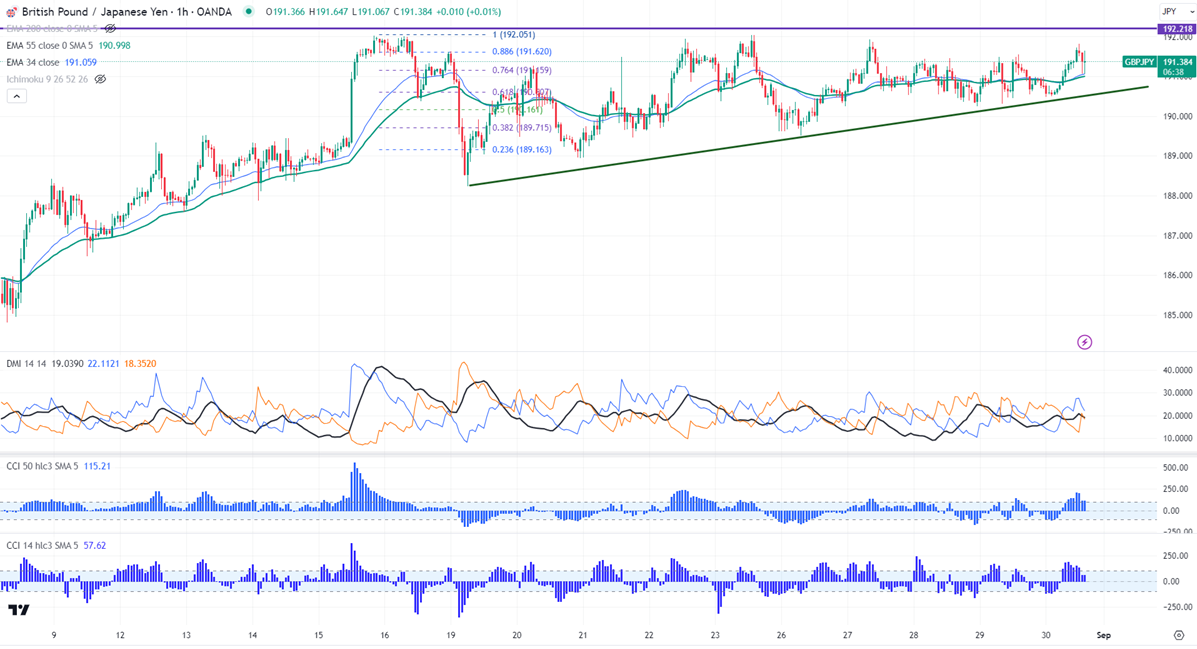 GBPJPY has taken support near 34 H EMA and showed a minor pullback. It hit a high of 191.81 at the time of writing and is currently trading around 191.55.