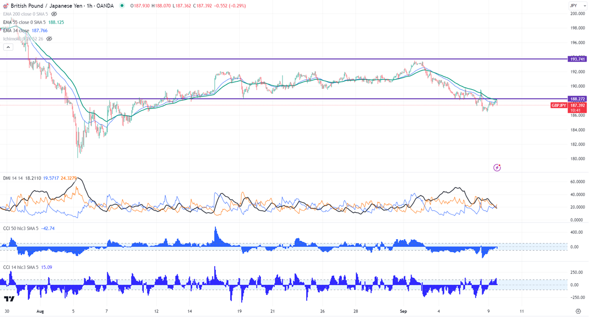 The pair trades below 34- and 55 EMA in the hourly chart. The resumption of a major downtrend will happen if it breaks below 186.40.