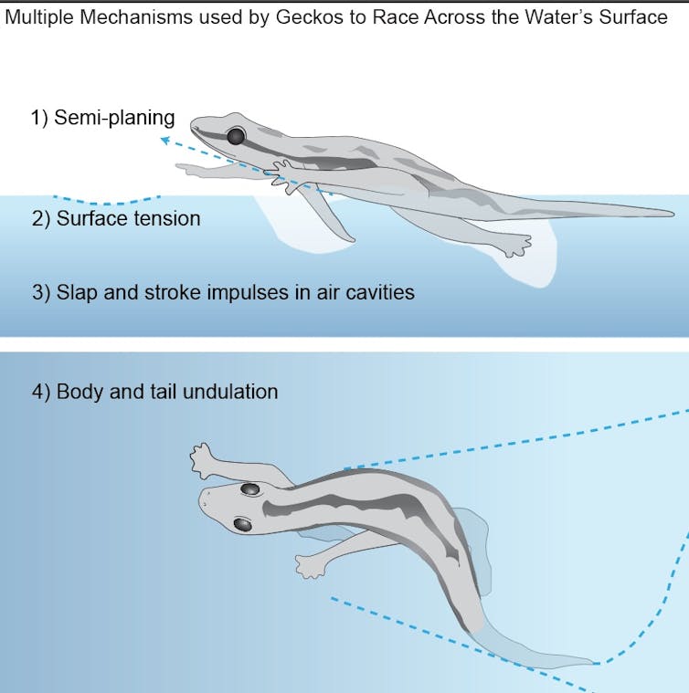 We also found that geckos crucially use a combination of hydrostatic force (the upwards push of the water known as buoyancy) and hydrodynamic force (the lift created by movement across the water’s surface like in a surface-skimming motorboat). Together, these forces generate additional lift for the gecko, a condition known as semi-planing.