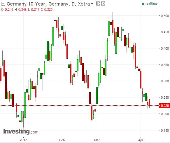 The German 10-year bund yields hit lowest Monday since February this year from mounting political uncertainty ahead of a number of crucial elections in the euro zone.