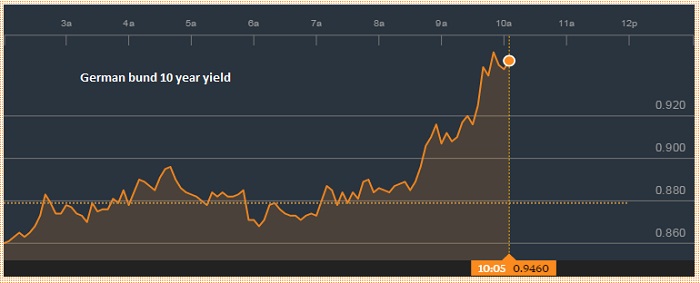 - After failed attempt last week, yields dropped towards 0.82% and kept hovering around the level. Today it has risen from 0.86%, now hovering around 0.95%, trying to break above 1%, which is psychologically important threshold.