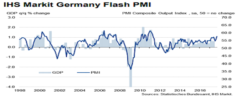 The IHS Markit Flash Germany Composite Output Index rose for the second month running in September to 57.8, up from 55.8 in August and its highest reading since April 2011. Average growth in the third quarter as a whole was robust but slightly below that seen in quarter two, reflecting the comparatively subdued rate of expansion seen in July.